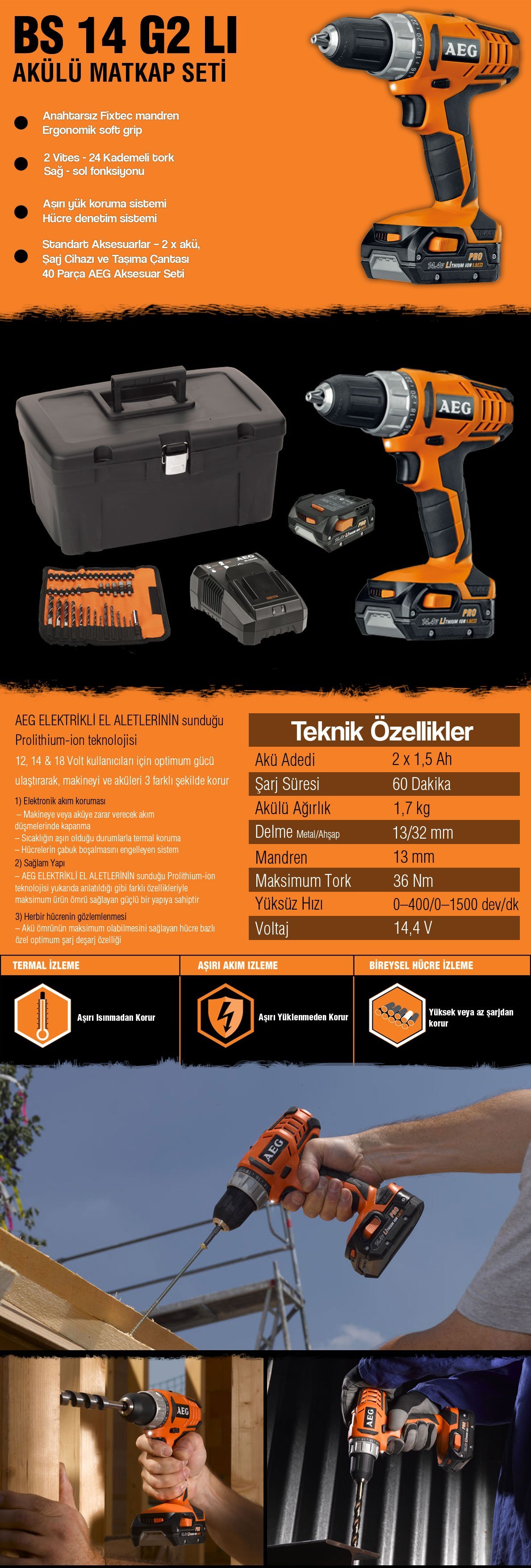 Aeg Bs 14 G2 Li 40 Parça 2 Akülü Çantalı Vidalama Seti