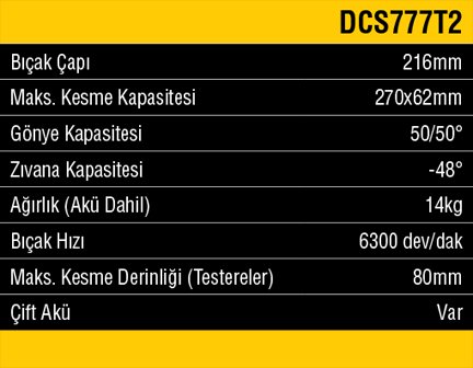 Dewalt DCS777T2-QW XR Flexvolt Kömürsüz 54V 216mm Kablosuz Gönye Testere Çift Akü